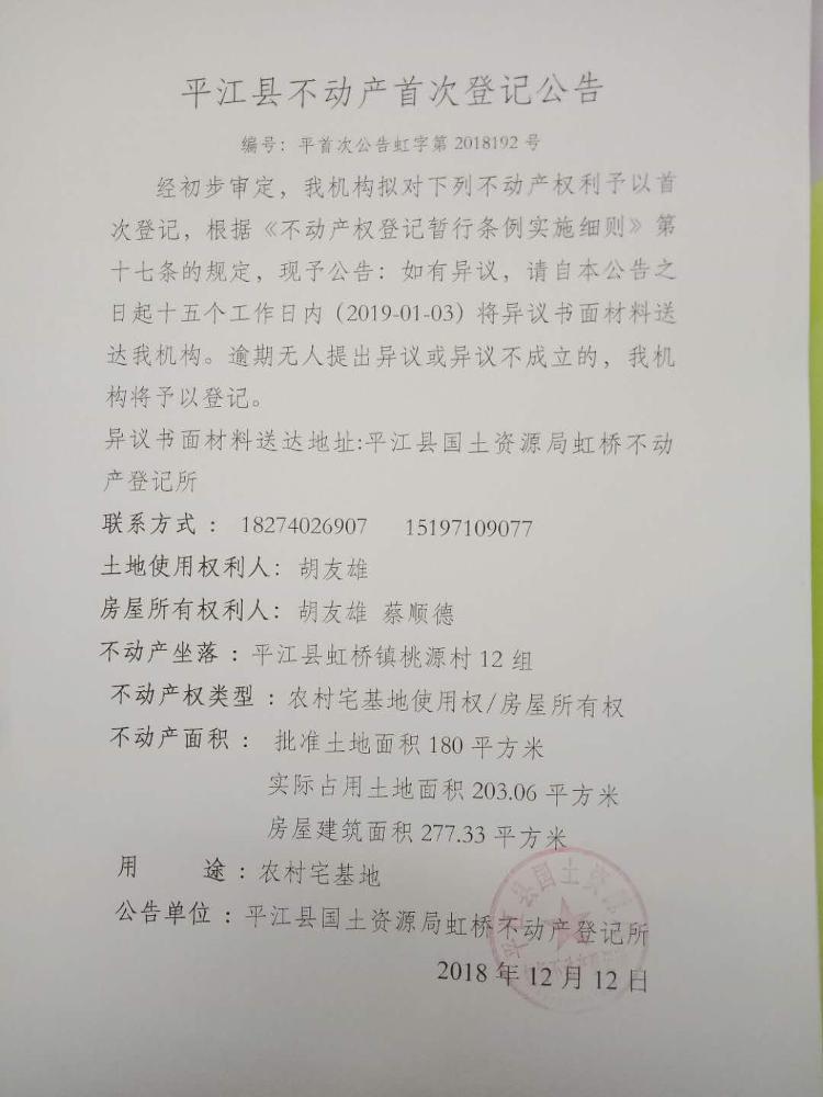 胡友雄蔡顺德平江县不动产首次登记平首次公告虹字第2018192号