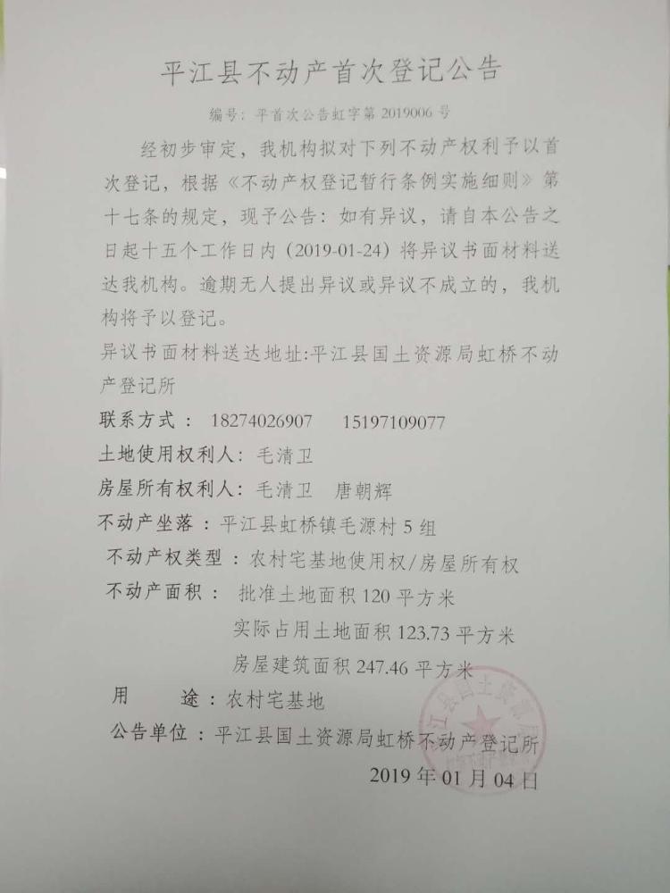 毛清卫唐朝辉平江县不动产首次登记平首次公告虹字第2019006号