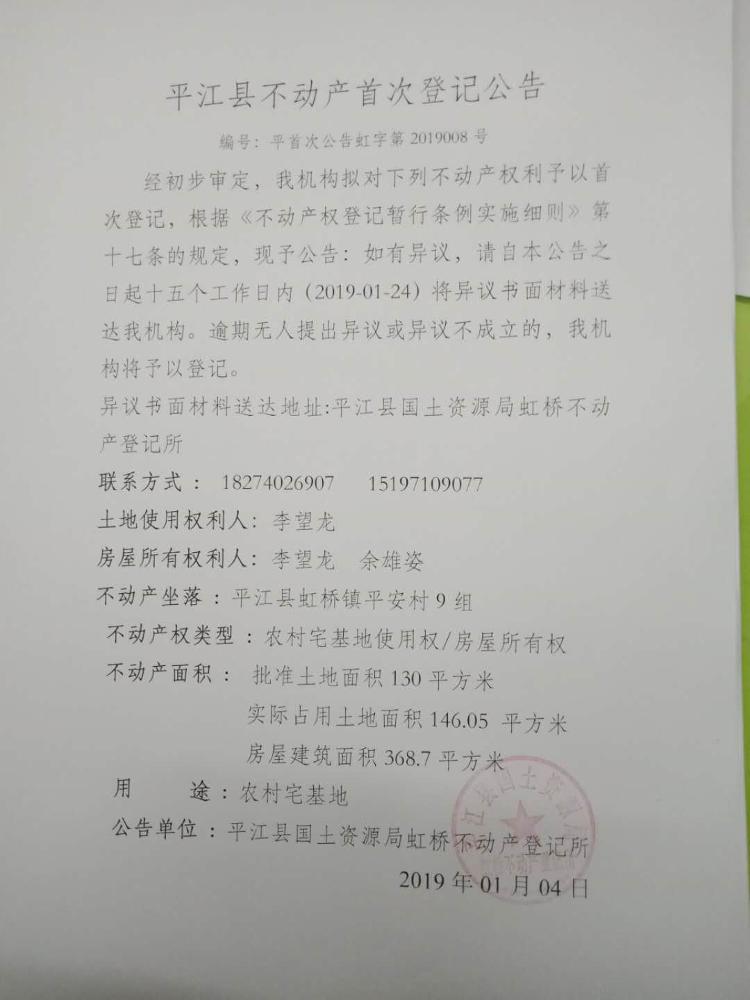 李望龙 余雄姿不动产首次登记公告 虹字第2019008号