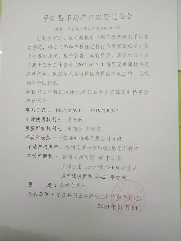 黄来秋 邓唾花不动产首次登记公告 虹字第2019010号