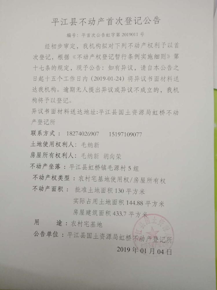 毛纳新 胡向荣不动产首次登记公告 虹字第2019011号