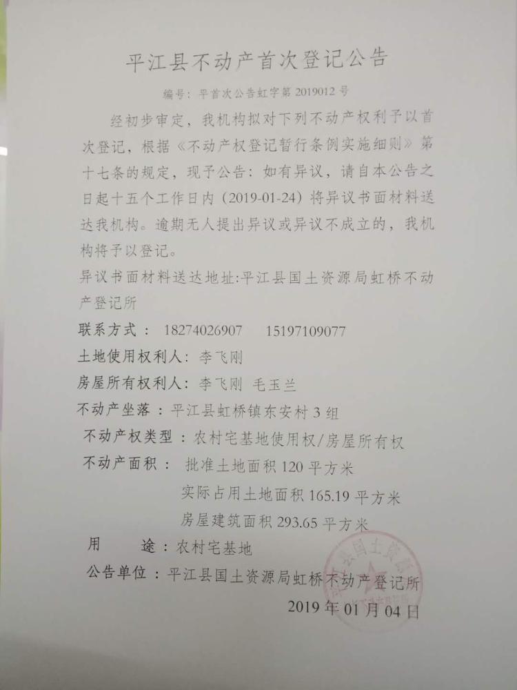 李飞刚 毛玉兰不动产首次登记公告 虹字第2019012号