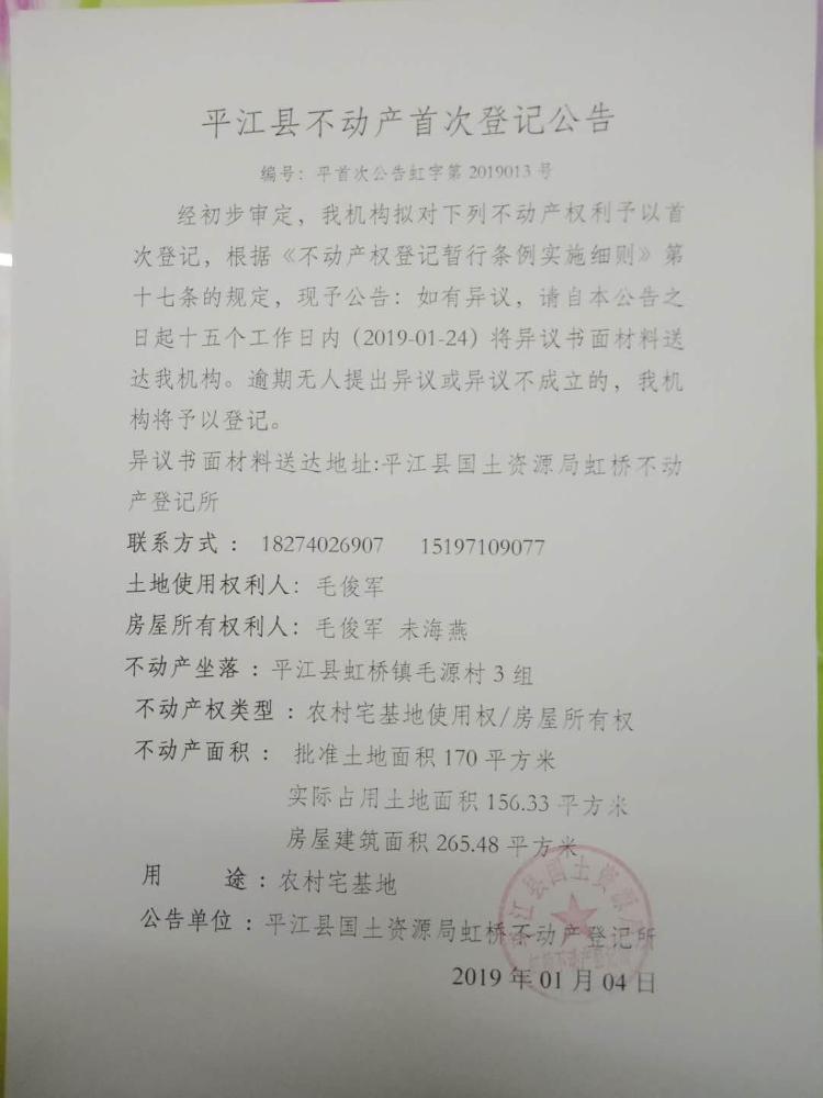 毛俊军 未海燕不动产首次登记公告 虹字第2019013号