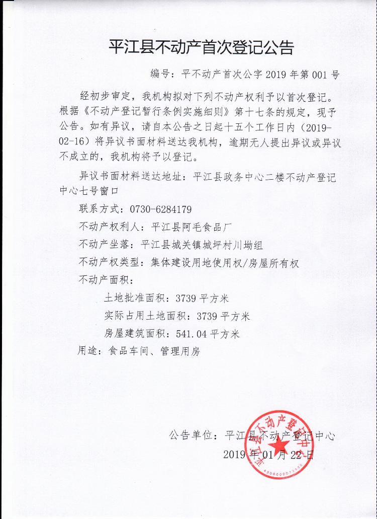 平江县阿毛食品厂平江县不动产首次登记公告 平不动产首次公字2019年第001号