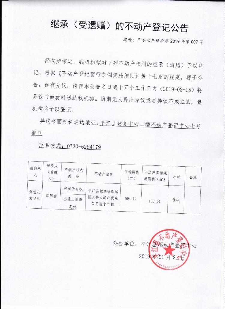 江阳春继承(受遗赠)的不动产登记公告 平不动产继公字2019年第007号