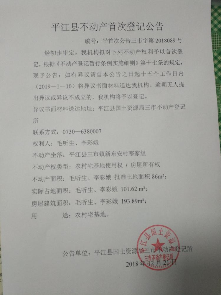 毛听生 李彩娥不动产首次登记公告 三市字第2018089号