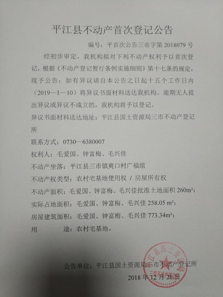 毛爱国 钟富梅 毛兴佳(两户联建)不动产首次登记公告 三市字第2018079号