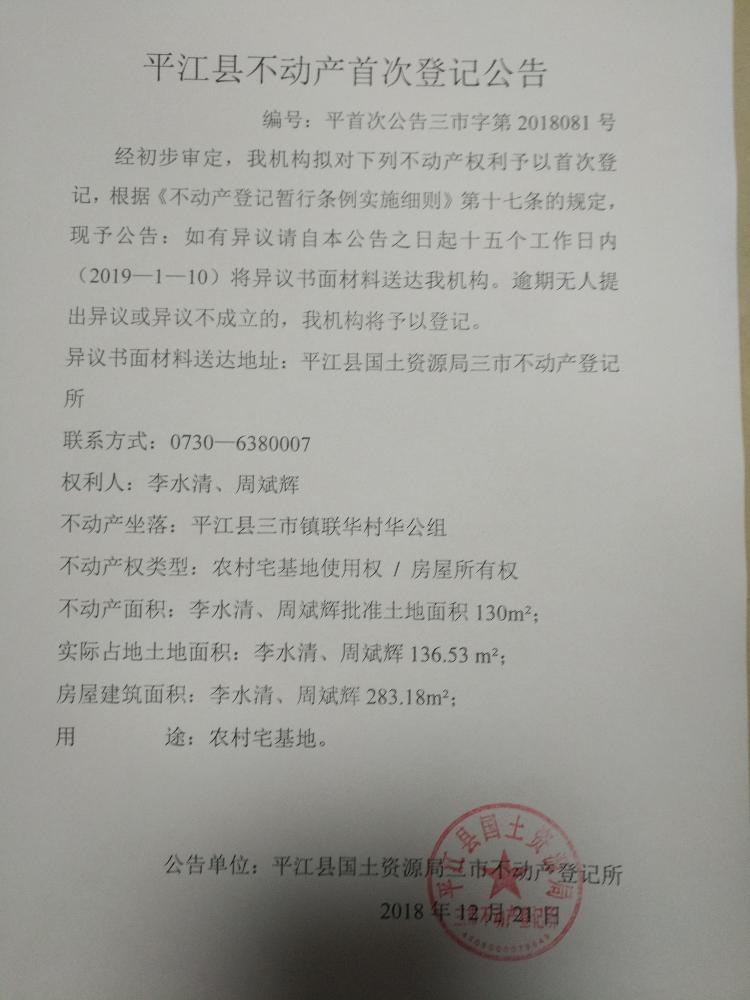 李水清 周斌辉不动产首次登记公告 三市字第2018081号