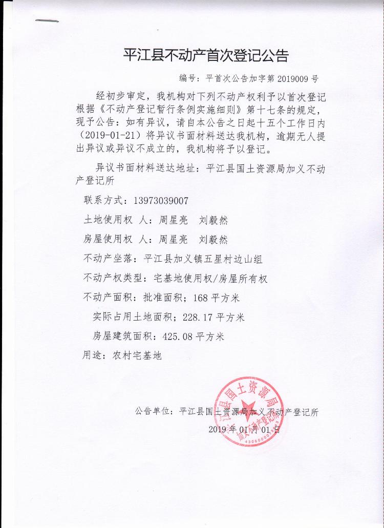 周星亮 刘毅然不动产首次登记公告 加字第2019009号