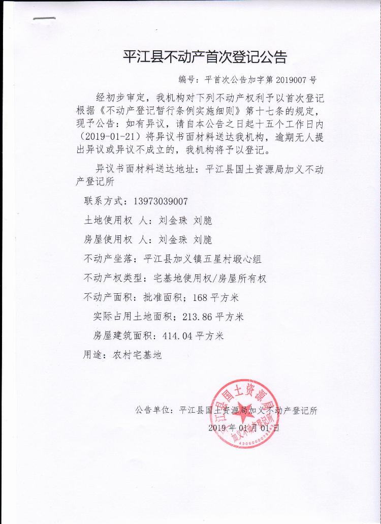 刘金珠 刘脆不动产首次登记公告 加字第2019007号