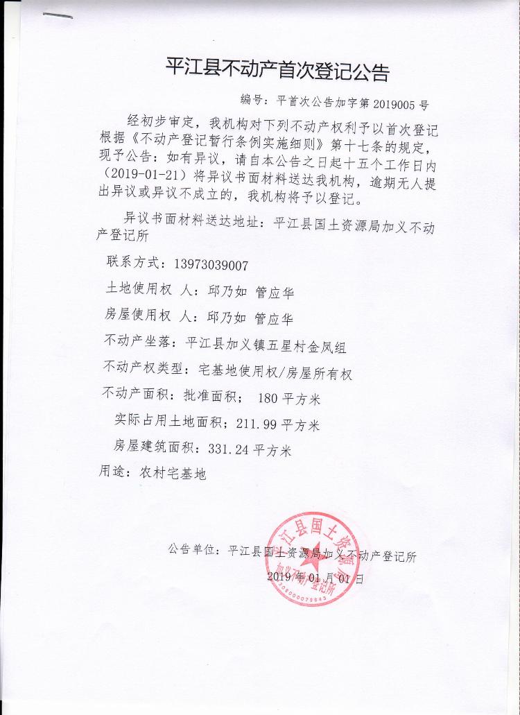 邱乃如 管应华不动产首次登记公告 加字第2019005号