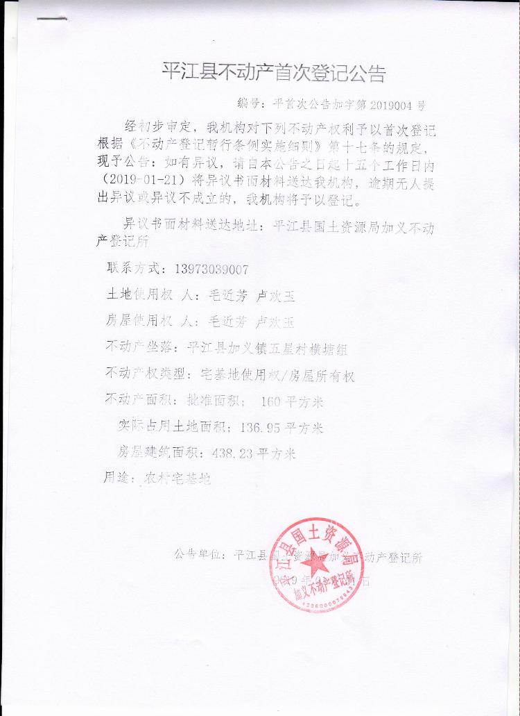 毛近芳 卢欢玉不动产首次登记公告 加字第2019004号