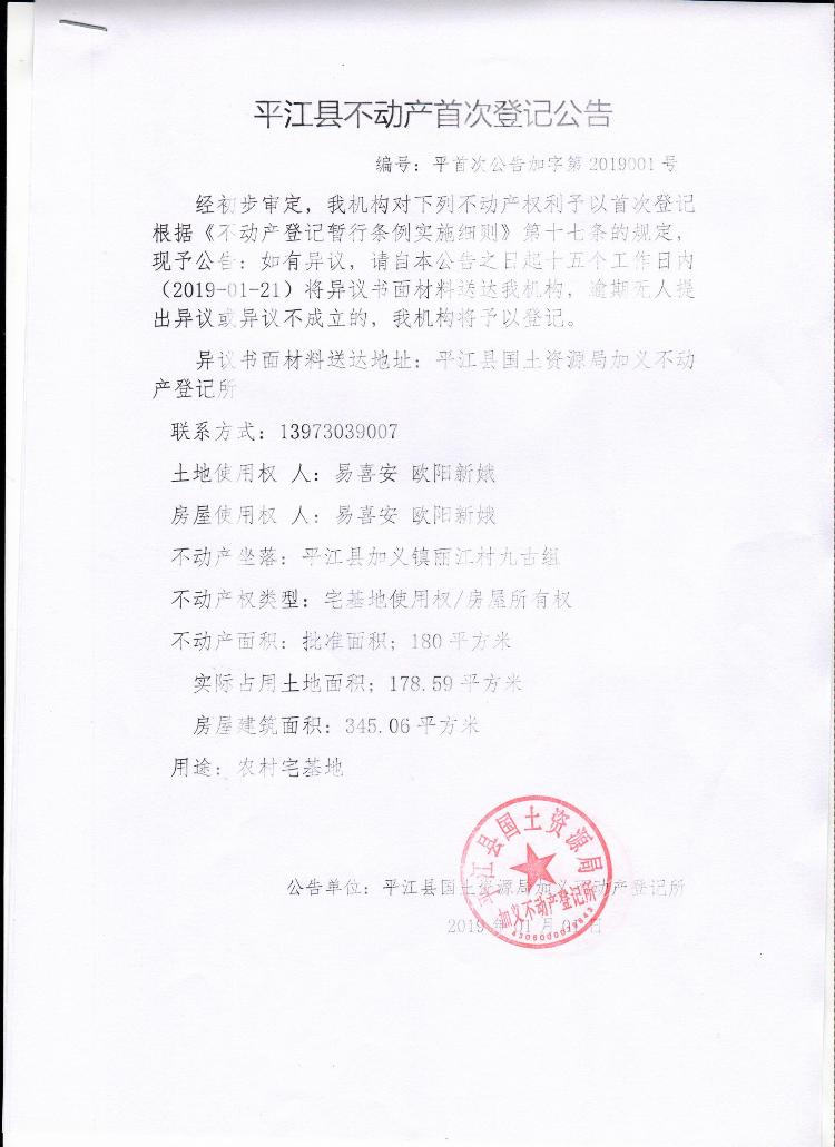 易喜安 欧阳新娥不动产首次登记公告 加字第2019001号