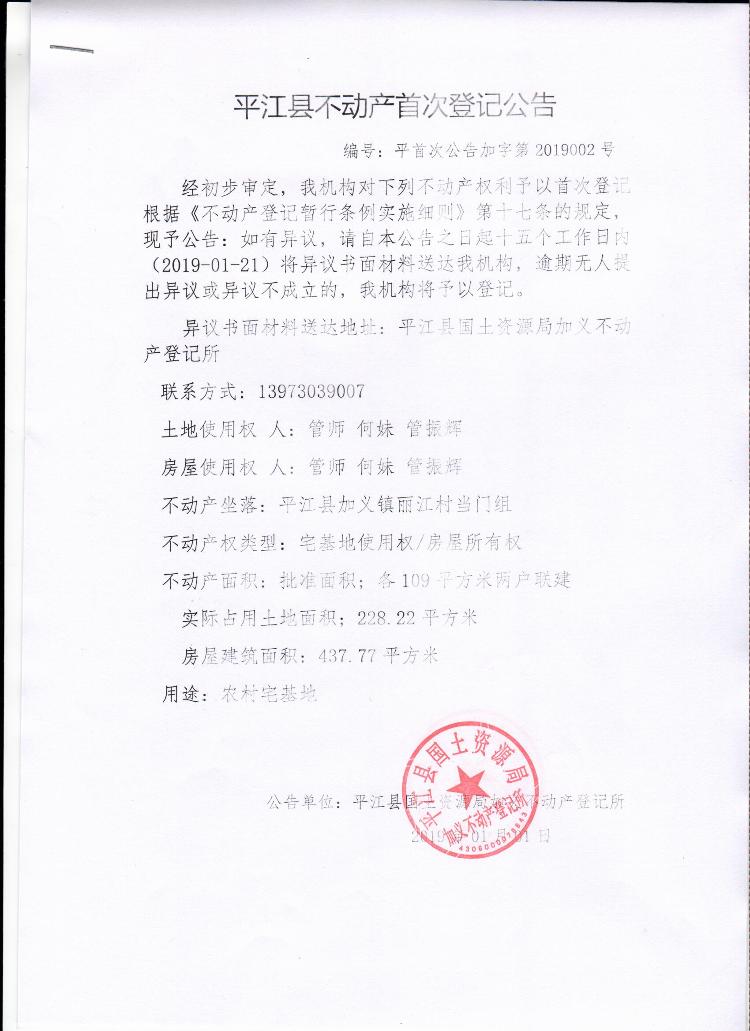 管师 何妹 管振辉不动产首次登记公告 加字第2019002号