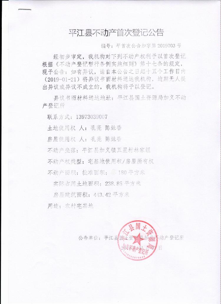 孔亮 陈妹香不动产首次登记公告 加字第2019003号