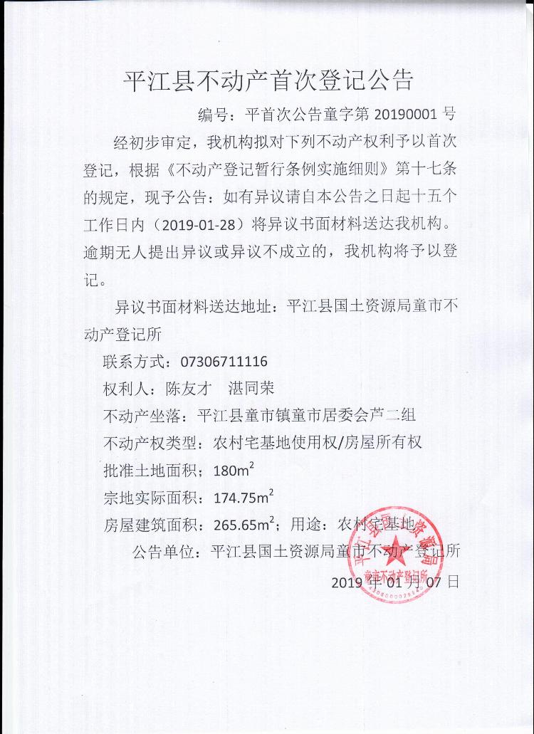 陈友才 湛同荣不动产首次登记公告 童字第20190001号