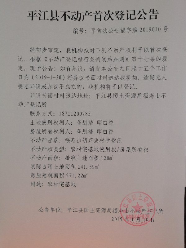 董划清 邱白香不动产首次登记公告 福字第2019010号