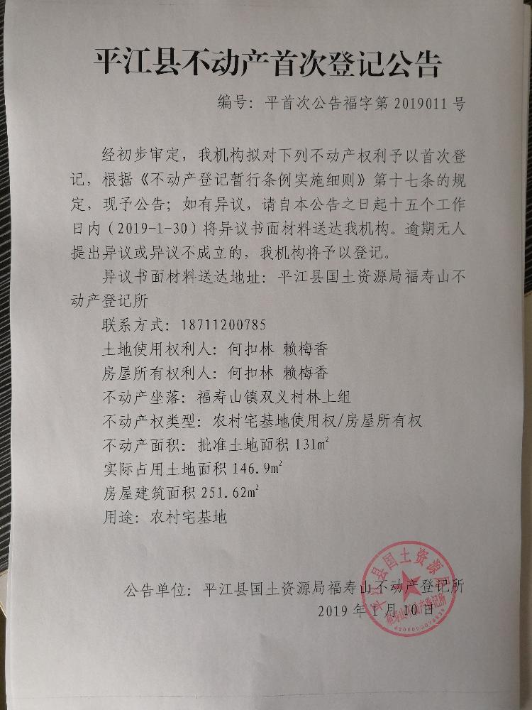 何扣林 赖梅香不动产首次登记公告 福字第2019011号