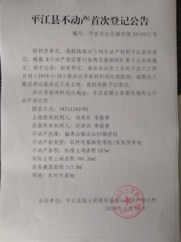 刘放兵 李放香不动产首次登记公告 福字第2019013号
