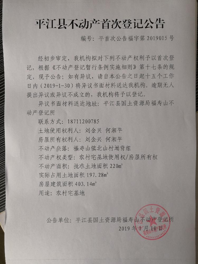 刘金兴 何湘平不动产首次登记公告 福字第2019015号