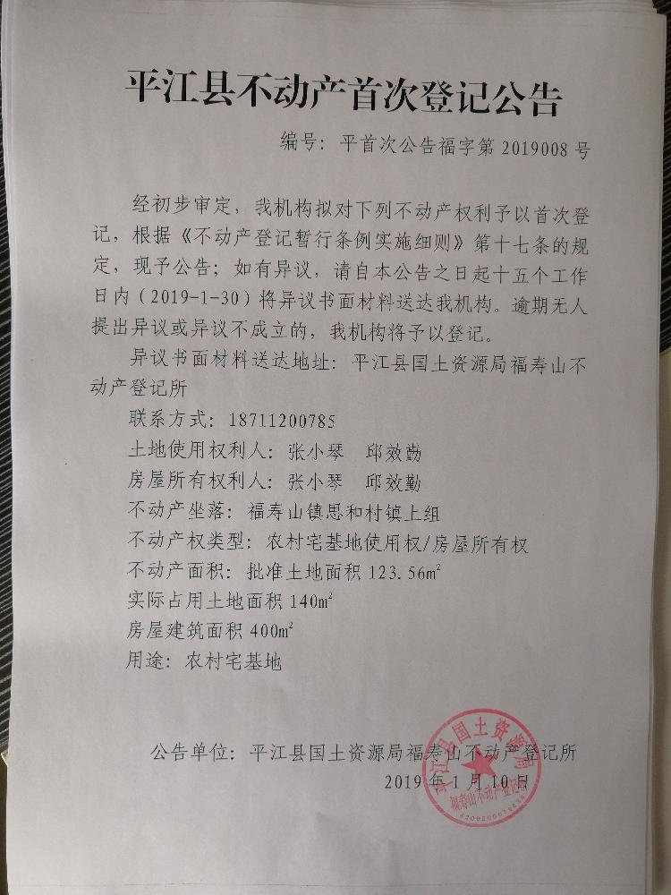 张小琴 邱效勤不动产首次登记公告 福字第2019008号