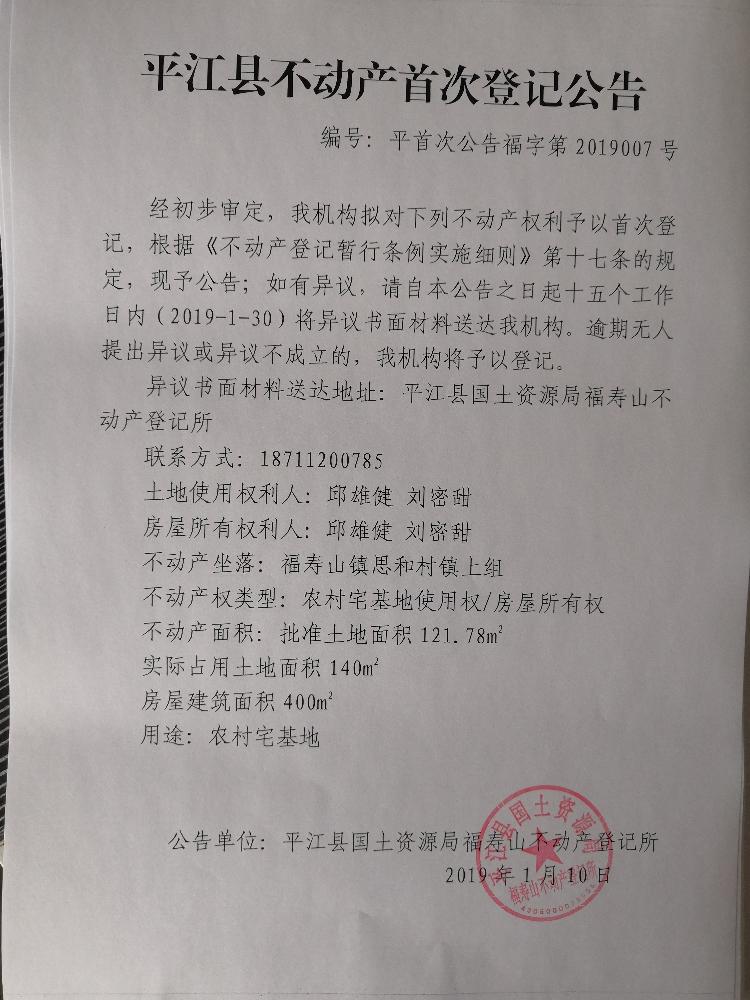 邱雄健 刘密甜不动产首次登记公告 福字第2019007号