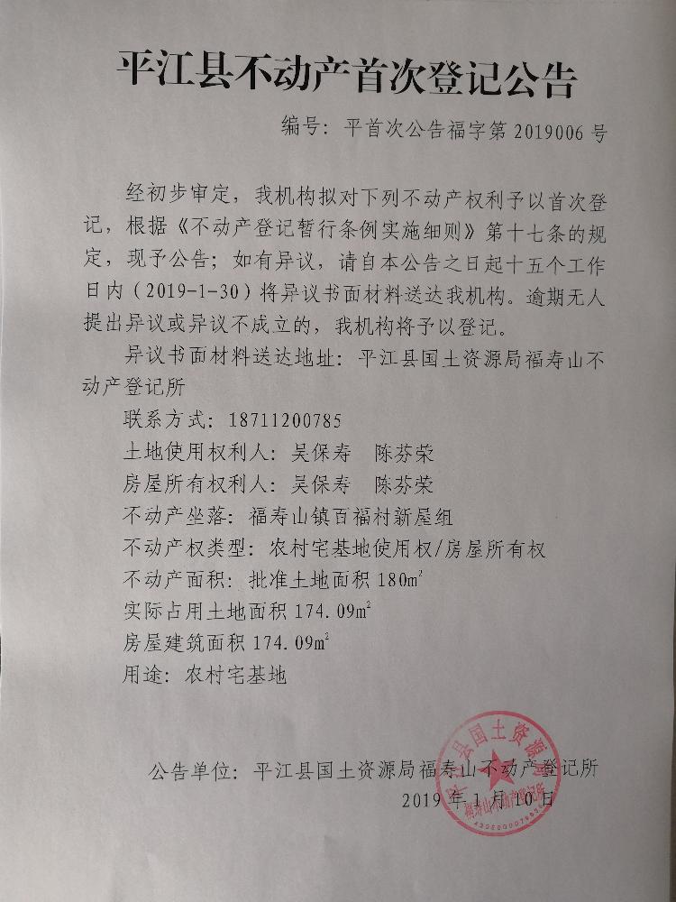吴保寿 陈芬荣不动产首次登记公告 福字第2019006号