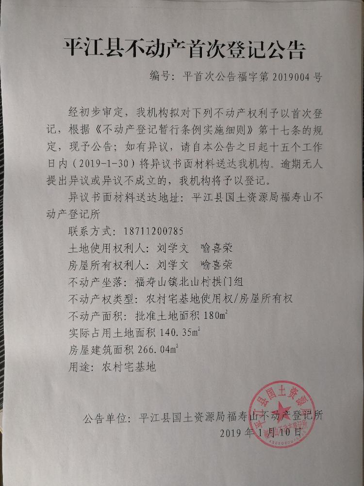 刘学文 喻喜荣不动产首次登记公告 福字第2019004号