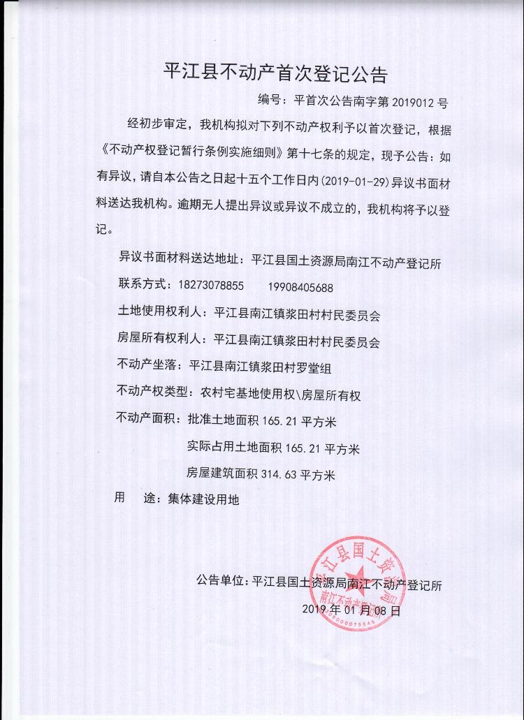 平江县南江镇浆田村村民委员会不动产首次登记公告 南字第2019012号