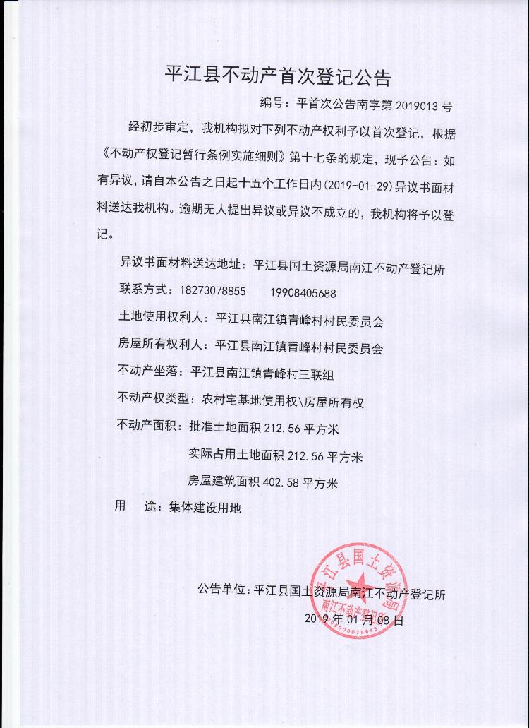 平江县南江镇青峰村村民委员会不动产首次登记公告 南字第2019013号
