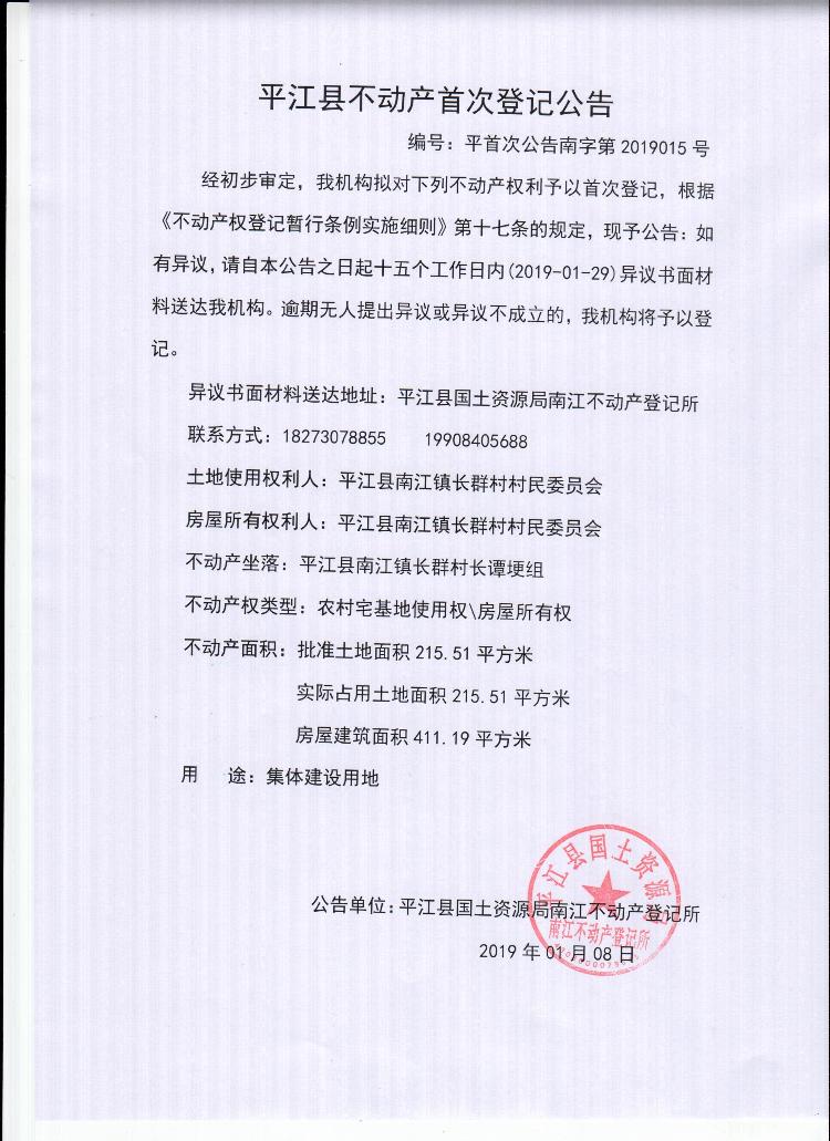 平江县南江镇长群村村民委员会不动产首次登记公告 南字第2019015号