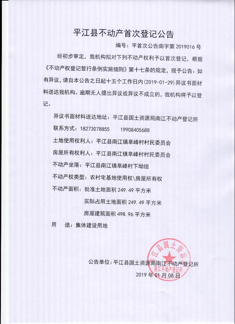 平江县南江镇阜峰村村民委员会不动产首次登记公告 南字第2019016号