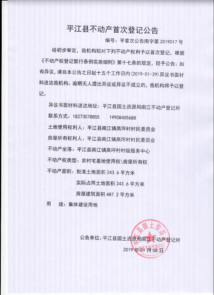 平江县南江镇高坪村村民委员会不动产首次登记公告 南字第2019017号