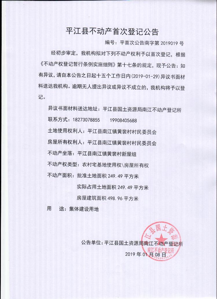 平江县南江镇黄裴村村民委员会不动产首次登记公告 南字第2019019号