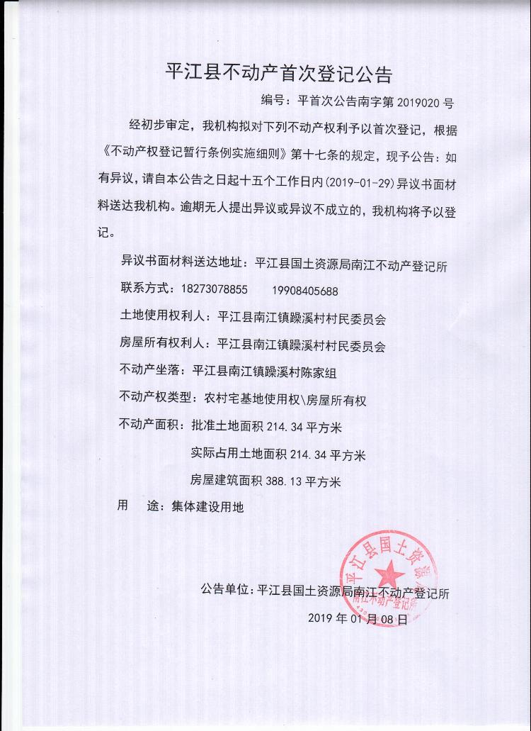平江县南江镇躁溪村村民委员会不动产首次登记公告 南字第2019020号