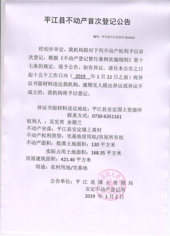 吴发贵 余婚兰不动产首次登记公告 安字2019033