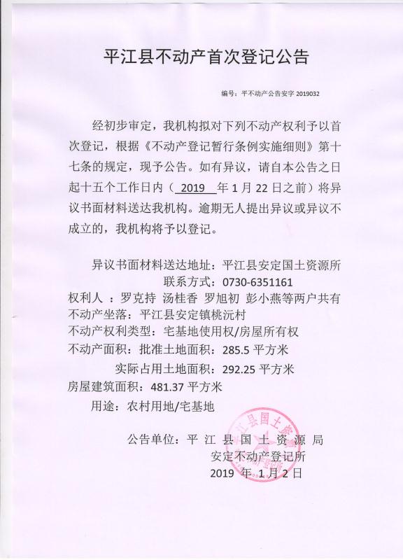 罗克特 汤桂香 罗旭初 彭小燕两户共有不动产首次登记公告 安字2019032