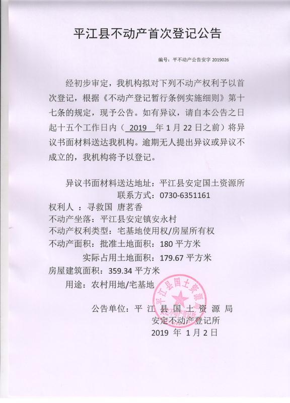 寻救国 唐茗香不动产首次登记公告 安字2019026