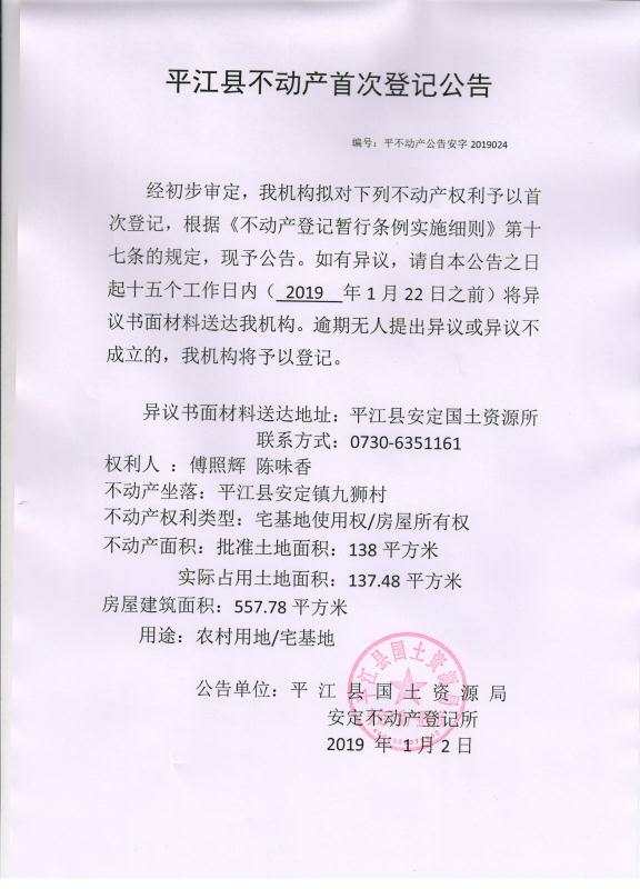 傅照辉 陈味香不动产首次登记公告 安字2019024