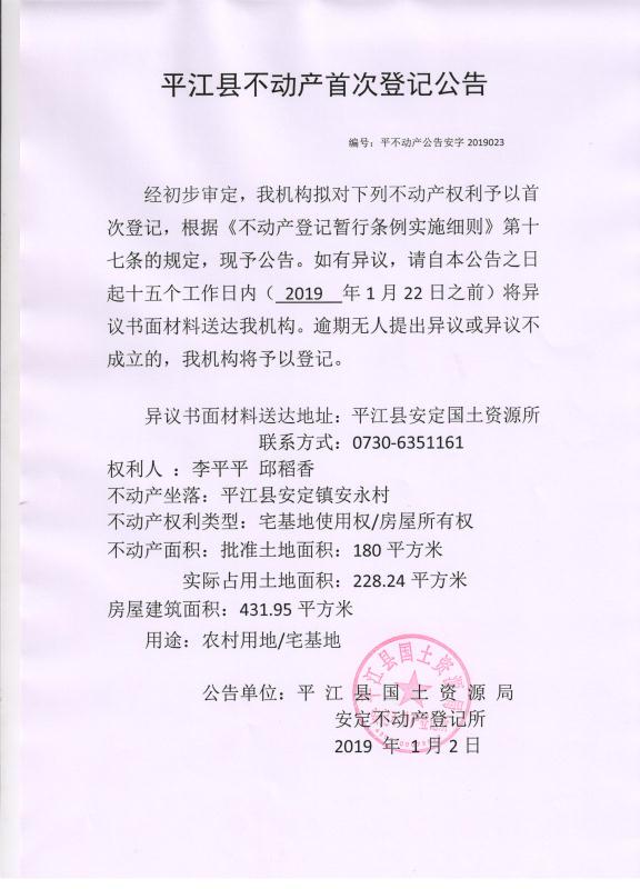 李平平 邱稻香不动产首次登记公告 安字2019023