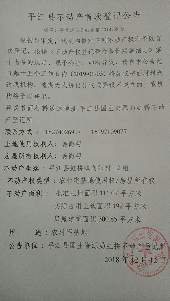 姜尚菊不动产首次登记公告 虹字第2018189号