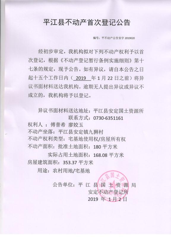 傅普希 廖姣玉不动产首次登记公告 安字2019020