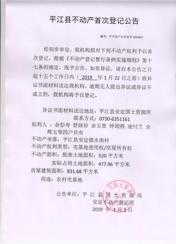 余彭寿 舒妹珍 余五贵 钟胡燕 凌忖兰 余辉玉等四户共有不动产首次登记公告 安字2019017