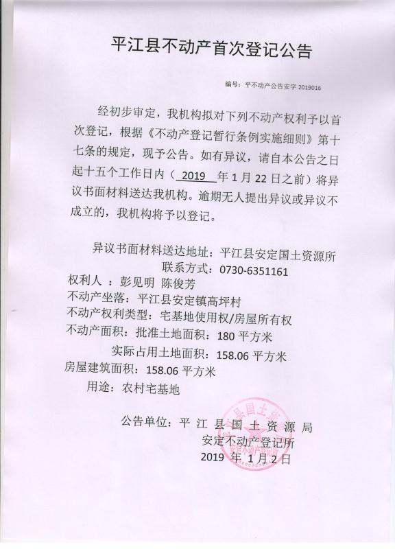 彭见明 陈俊芳不动产首次登记公告 安字2019016