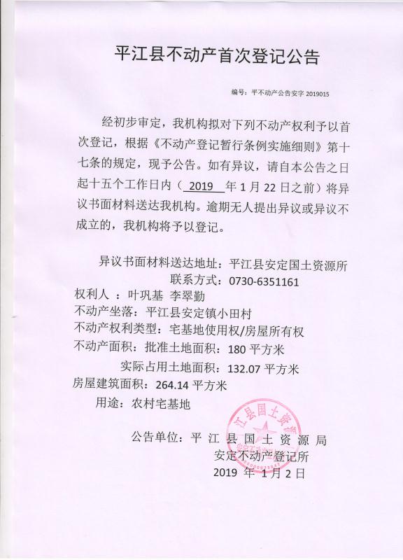 叶巩基 李翠勤不动产首次登记公告 安字2019015
