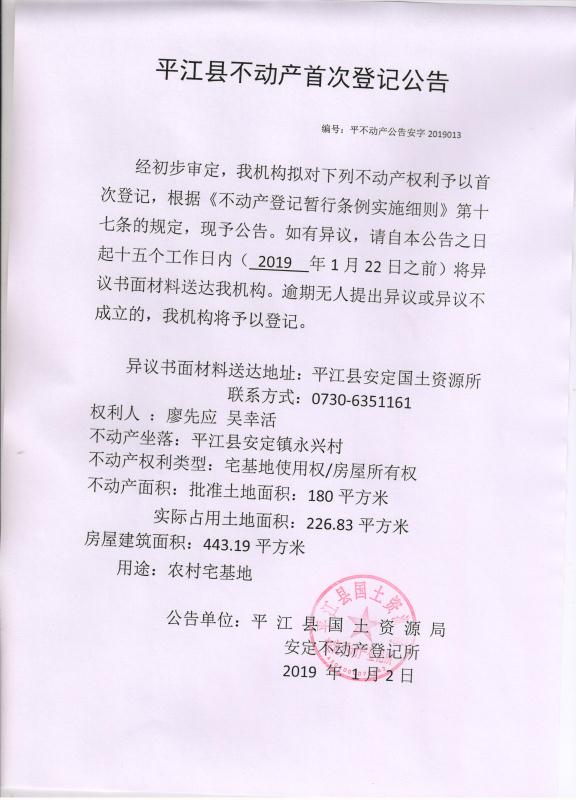 廖先应 吴幸活不动产首次登记公告 安字2019013