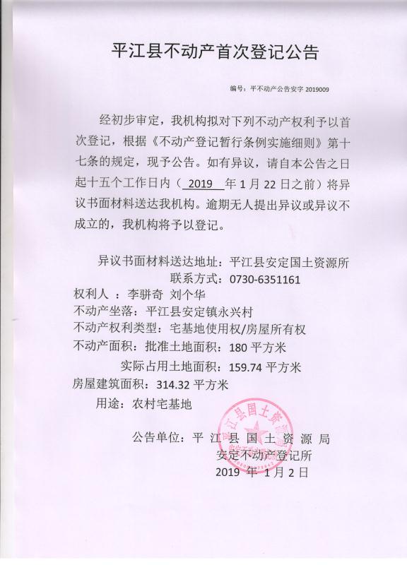 李骈奇 刘个华不动产首次登记公告 安字2019009
