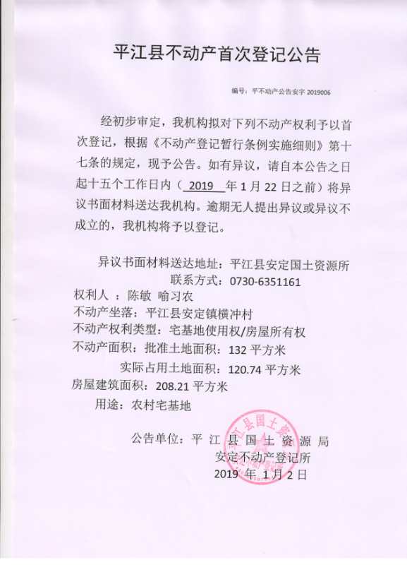 陈敏 喻习农不动产首次登记公告 安字2019006