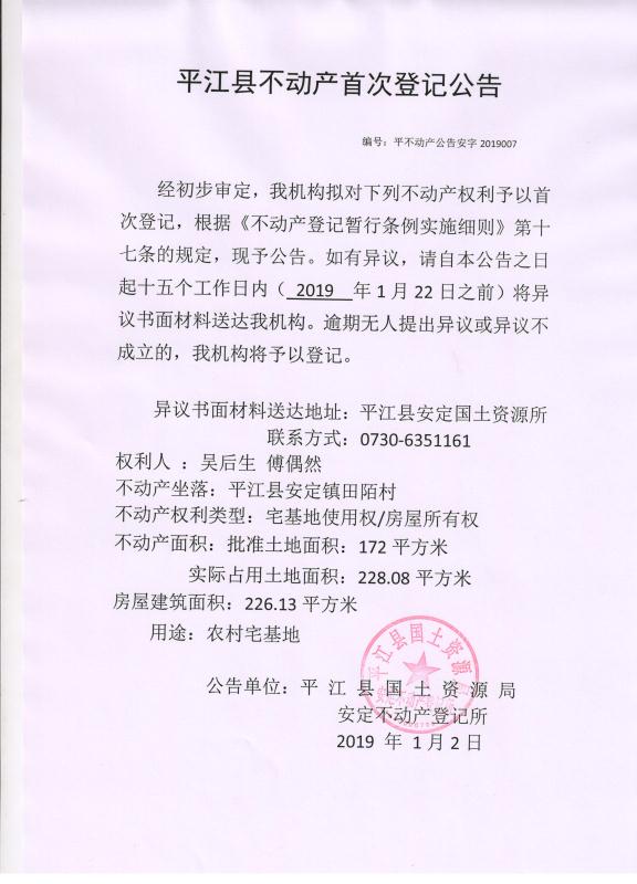 吴后生 傅偶然不动产首次登记公告 安字2019007