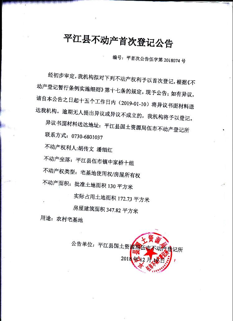 胡传文 潘细红 不动产首次登记公告伍字第2018074号